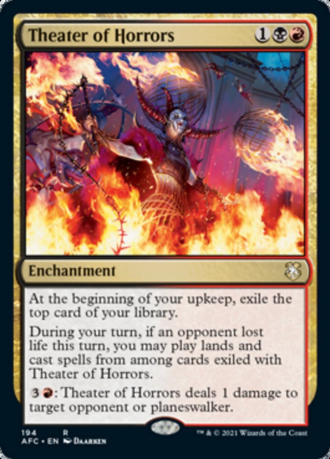 During your turn, if an opponent lost life this turn, you may play lands and cast spells from among cards exiled with Theater of Horrors.